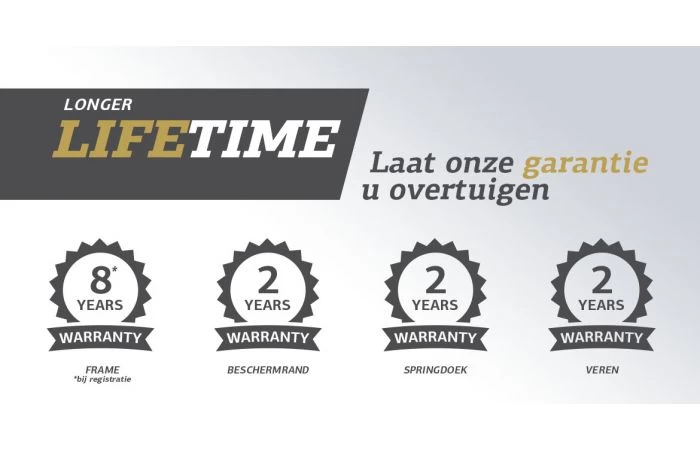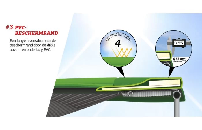 Het duurzame springdoek van de Favorit is gemaakt van zeer sterk geweven polypropyleen. De lussen voor de metalen verenogen zijn bevestigd met 8 rijen stiksel. Door de open netstructuur wordt het springdoek niet heet en is het ook niet heet aan de voeten.