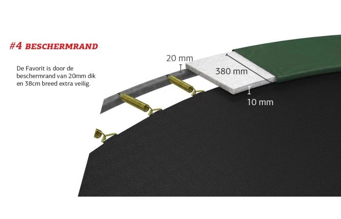 Alle maten van de Favorit-lijn zijn uitgevoerd met deze veren. Hierdoor spring je heerlijk op al deze trampolines. Het springcomfort van deze trampolines is in vergelijking met de eerdere BERG Talent-lijn met GoldSpring Talent veren veel hoger.