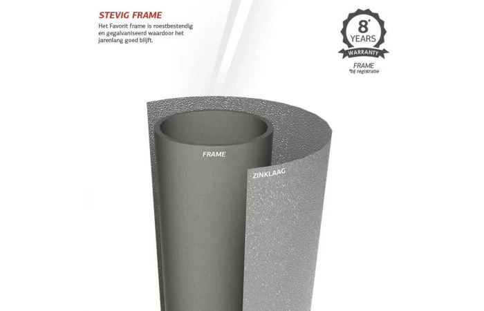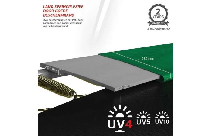 Het duurzame springdoek van de Favorit is gemaakt van zeer sterk geweven polypropyleen. De lussen voor de metalen verenogen zijn bevestigd met 8 rijen stiksel. Door de open netstructuur wordt het springdoek niet heet en is het ook niet heet aan de voeten.