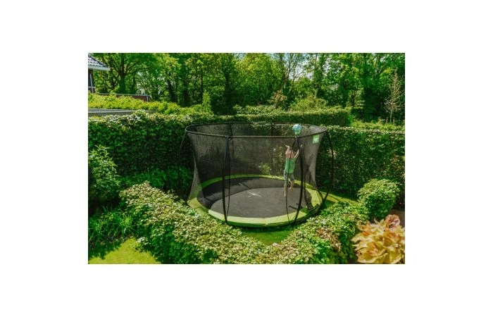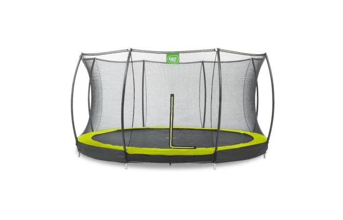De EXIT Silhouette inground trampoline is een grote ronde trampoline met een limoengroene beschermrand. In een handomdraai graaf je een kuil in de grond waar de trampoline in wordt gezet voor een mooi en veilig resultaat. Zo hoef je je als ouders geen zorgen te maken dat de kinderen bij een missprong van een hoge trampoline af kunnen vallen.
