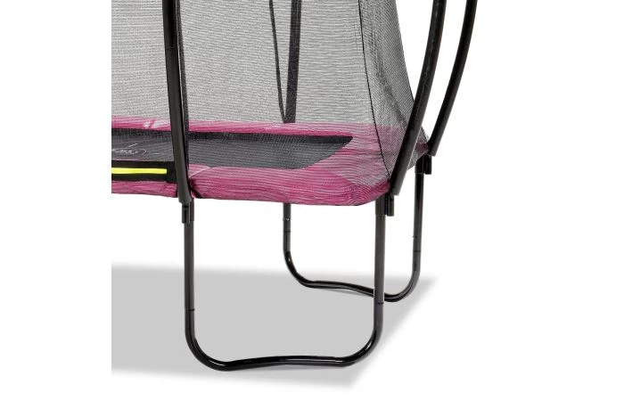 De EXIT Silhouette trampoline op poten is een compacte rechthoekige trampoline met een roze beschermrand. Het veiligheidsnet, dat standaard wordt meegeleverd met de trampoline op poten, is voorzien van gebogen staanders zodat het net strakgespannen staat. Dit is niet alleen extra veilig omdat kinderen niet in het net kunnen blijven hangen, maar het oogt ook rustiger in de tuin. Het veiligheidsnet is voorzien van een fluorescerende groene ritssluiting die goed opvalt, zodat je direct kunt zien of de rits goed is gesloten.