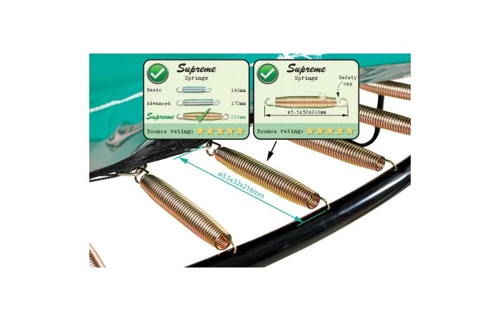 De dubbel conische veren van de trampoline, die maar liefst 21,6 centimeter lang zijn, zorgen voor een hoge sprong en een fijne zachte landing. Het unieke ontluchtingssysteem van de springmat en beschermrand zorgt voor een open structuur zodat de lucht eenvoudig kan ontsnappen tijdens het springen. Daarnaast heeft de Supreme trampoline van EXIT Toys een extra stevige beschermrand van 44 centimeter breed en 4 centimeter dik voorzien van een voetbeschermingssysteem. Tijdens het trampolinespringen kun je dus nooit met je voeten in de veren komen.