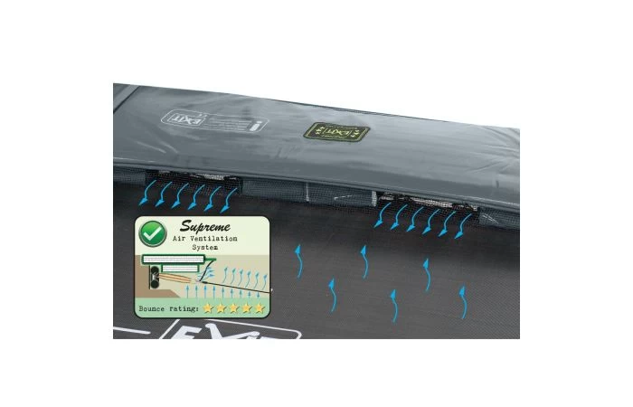 De EXIT Supreme trampoline is een ronde trampoline van absolute topkwaliteit met dubbelconische veren die zorgen voor een hoge sprong en een fijne zachte landing. Voor de EXIT Supreme graaf je een diepe kuil in de grond zodat de trampoline volledig op grondniveau staat voor een mooi en veilig resultaat. in De springmat en beschermrand zijn voorzien van een uniek ontluchtingssysteem met een open structuur zodat de lucht eenvoudig kan ontsnappen tijdens het trampolinespringen.