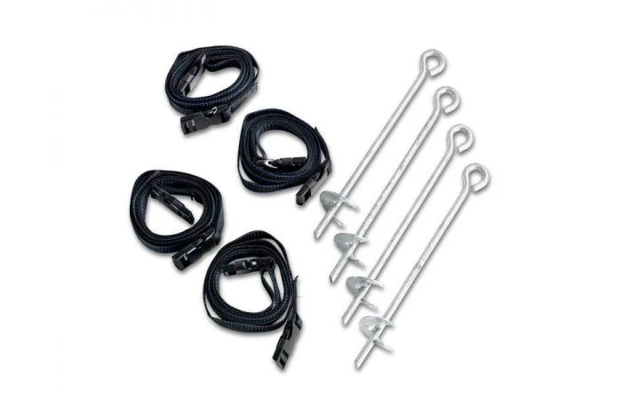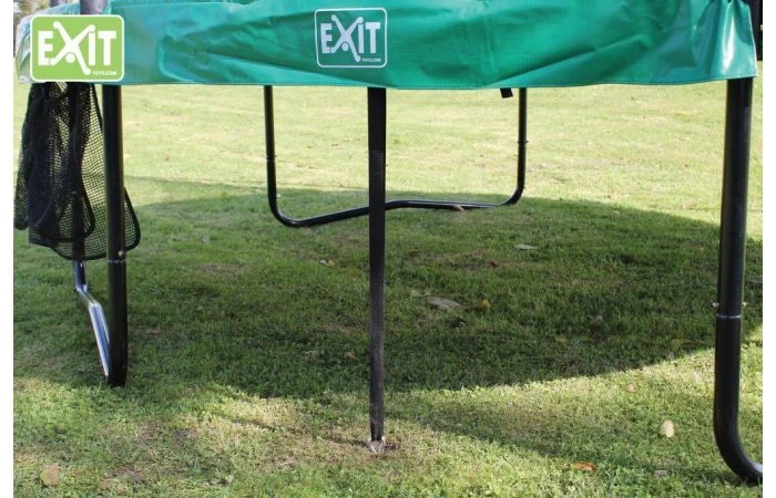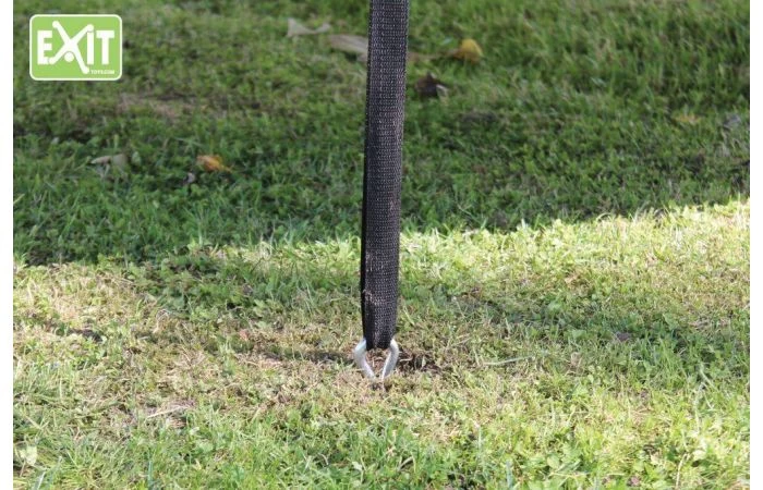 EXIT Trampoline Verankeringsset. Met deze verankeringsset kunt u de trampoline veilig verankeren met de grond. Hierdoor staat de trampoline stevig vast en wordt voorkomen dat deze kan verschuiven of om kan waaien tijdens storm. De set bestaat uit 4 grondankers en 4 banden.