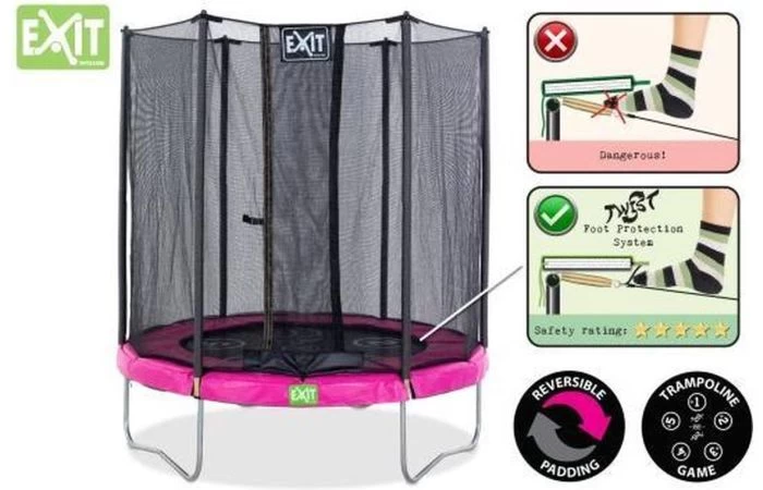 De dubbel conische veren, hoogwaardige beschermrand en het stevige frame zorgen voor optimaal springcomfort tijdens het trampolinespringen. En voor extra veiligheid is de beschermrand voorzien van een voetbeschermingssysteem zodat je niet met je voet tussen de veren kunt komen. Kies voor de unieke EXIT Twist trampoline en beleef de leukste avonturen!