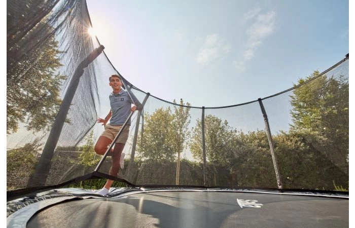 Voor de Salta First Class zijn de beste en sterkste materialen gebruikt. De trampoline is uitgevoerd met extra dikke gegalvaniseerde buizen zodat je zeker bent van de meest solide frameconstructie. De First Class is met zijn unieke en strakke design een echte uitblinker in je tuin! De glanzende veiligheidsrand met een dikte van maar liefst 0,76 mm, geeft de First Class een hoogwaardige en zeer luxe uitstraling. De rand is ultrasterk en extra breed om zo de conische veren veilig te bedekken. Met een veerlengte van 210 mm kun je hoge en krachtige sprongen maken. Mocht je je stabiliteit of evenwicht tijdens het springen even verliezen, dan zorgt het strakke fijnmazige veiligheidsnet met zelfsluitende ingang ervoor dat je altijd veilig en zacht landt.